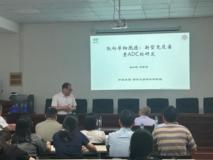 张和胜董事长作了题为《靶向单细胞癌:新型免疫毒素ADC的研发》的学术报告,从靶点选择、 linker 技术、毒素优化、产业化放大等多个维度,系统阐述了新型免疫毒素ADC的设计思路与技术难点,并特别强调了“从临床需求出发,以产业化思维推动源头创新”的研发理念。讲座由药学院院长袁涛教授主持,药学院、化学化工学院等相关专业师生踊跃参加,并就ADC药未来发展趋势、肿瘤靶向药设计原理和方法、如何实现在ADC半衰期延长的同时减低免疫原性等问题进行了交流讨论。