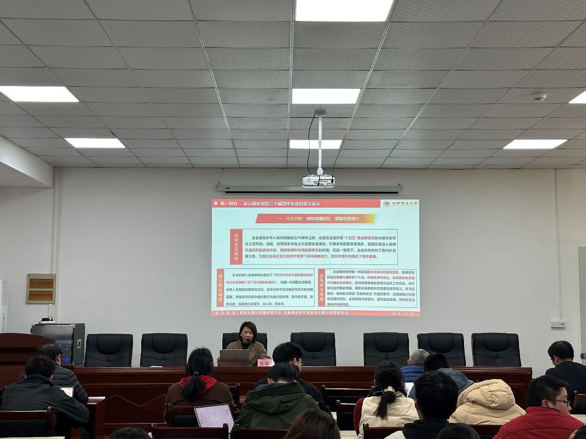 报告会上,吴郁琴以《坚持不懈以中国式现代化全面推进中华民族伟大复兴》为主题,从深入领会党的二十届四中全会的重大意义,关照回溯历次“五年规划”的演进及逻辑,全面理解“十五五规划建议”的原则目标等几大方面,为学院师生,全面把握好、贯彻落实好党的二十届四中全会精神作了系统宣讲和深入阐释。